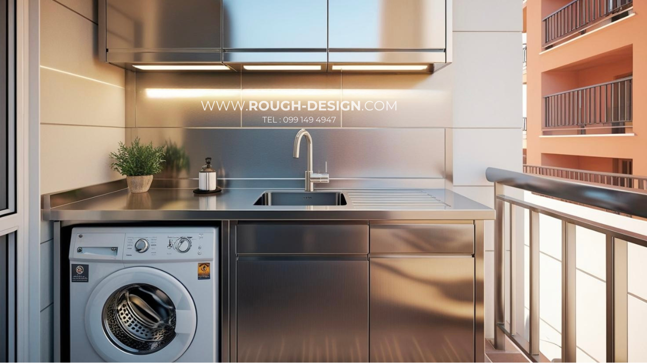 ปกติระเบียงคอนโดจะมีพื้นที่ไม่เกิน 1.5-2 เมตร เราจึงออกแบบชุดครัวแบบบิ้วอินให้พอดีกับพื้นที่ โดยเน้น: