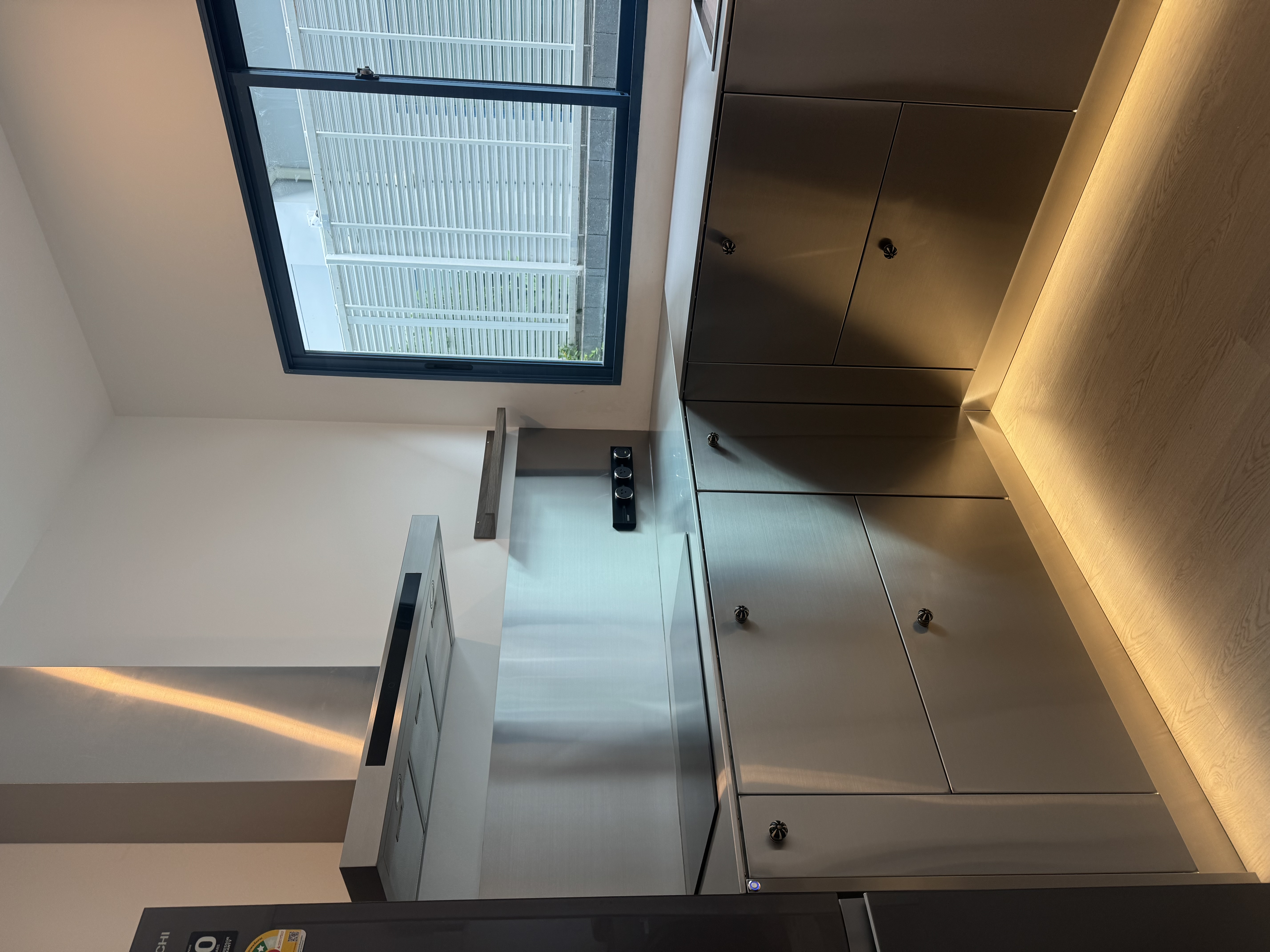 ผิวสัมผัสมีความเงาเหมือนแก้ว (Glass-like finish) เมื่อแสงไฟในครัวตกกระทบจะดูหรูหรามาก เข้ากับความเงาของหน้าบานสแตนเลสของ Rough Design ได้อย่างลงตัว