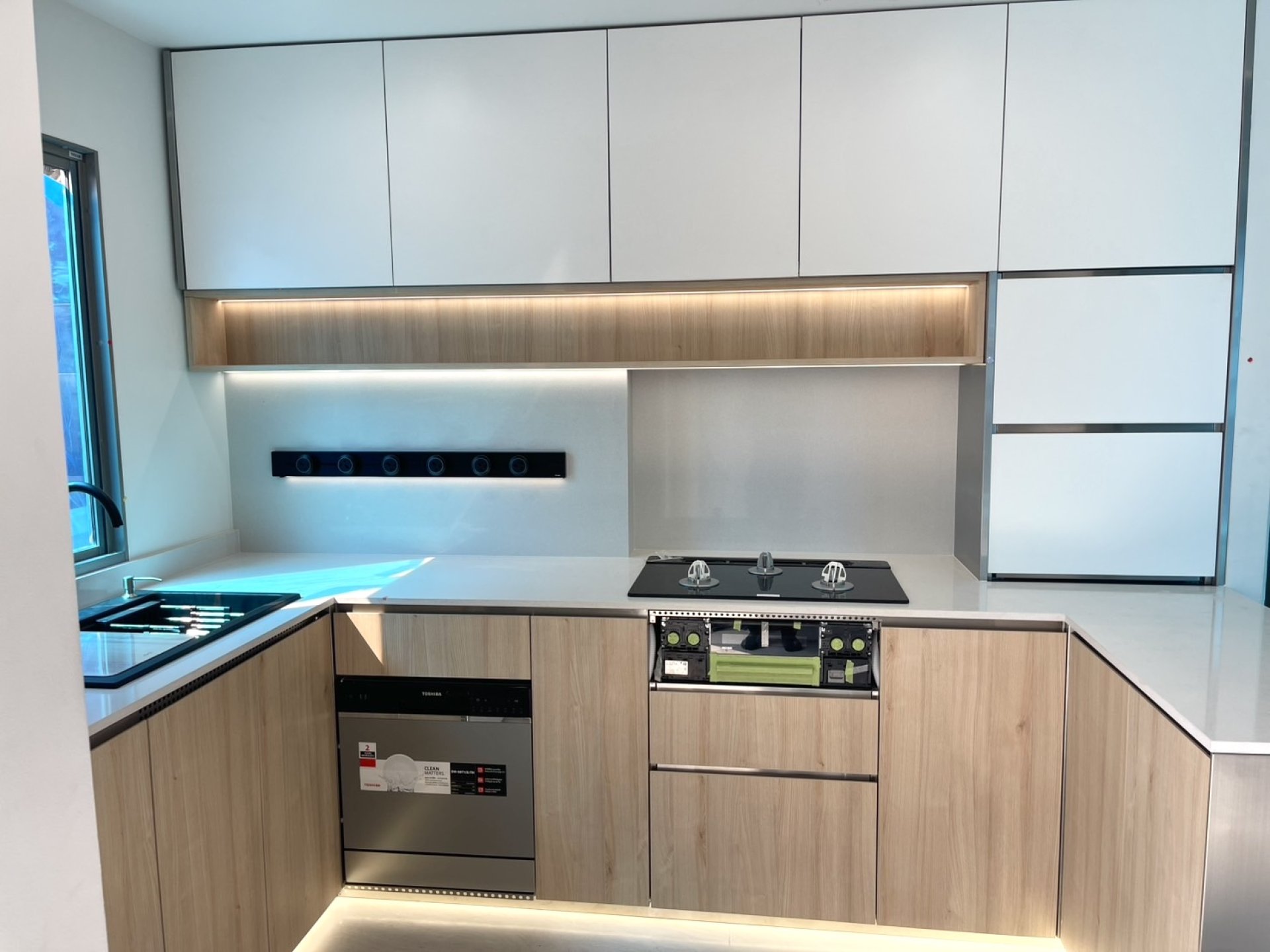 1. ตู้แขวนโชว์ของไม่มีหน้าบาน เพื่อให้ลูกค้าโชว์ผิวสแตนเลสของตัวตู้ได้อย่างเต็มที่ เมื่อแสงไฟกระทบแผ่นสแตนเลส จะเกิดความเงาวิบวับ เพิ่มความหรูหราของชุดตู้ได้อย่างดี